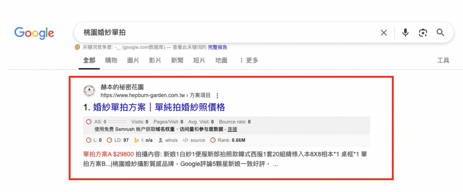 赫本並不追求大量曝光,而是希望在具有明確需求的搜尋情境下,例如「古裝婚紗照」、「婚紗工作室推薦」、「桃園婚紗風格」等關鍵字,網站能穩定出現在搜尋首頁,讓潛在新娘在蒐集資訊的第一步就能看見赫本、留下好印象。目標是建立一個能長期穩定引流的新客接單管道,並逐步降低對社群與廣告的依賴。