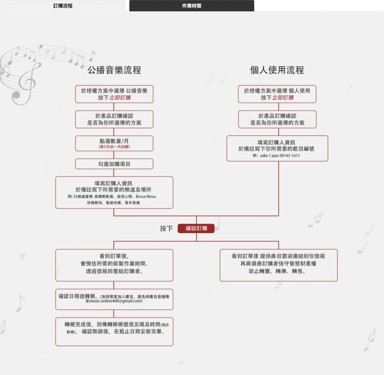 採用一頁式網站,網站以單頁式設計呈現,讓訪客滑動即可完整瀏覽內容,重點放在資訊清楚呈現、操作簡單、試聽即時三大優勢。無需跳轉頁面,訪客從上滑到下,就能完整認識服務特色、了解申辦流程、直接點擊播放音樂試聽,簡潔又高效的設計方式,帶來更良好的瀏覽體驗。