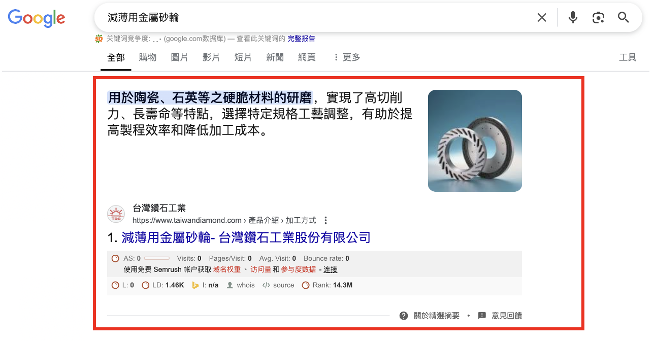 「減薄用金屬砂輪」 收錄於google精選摘要
