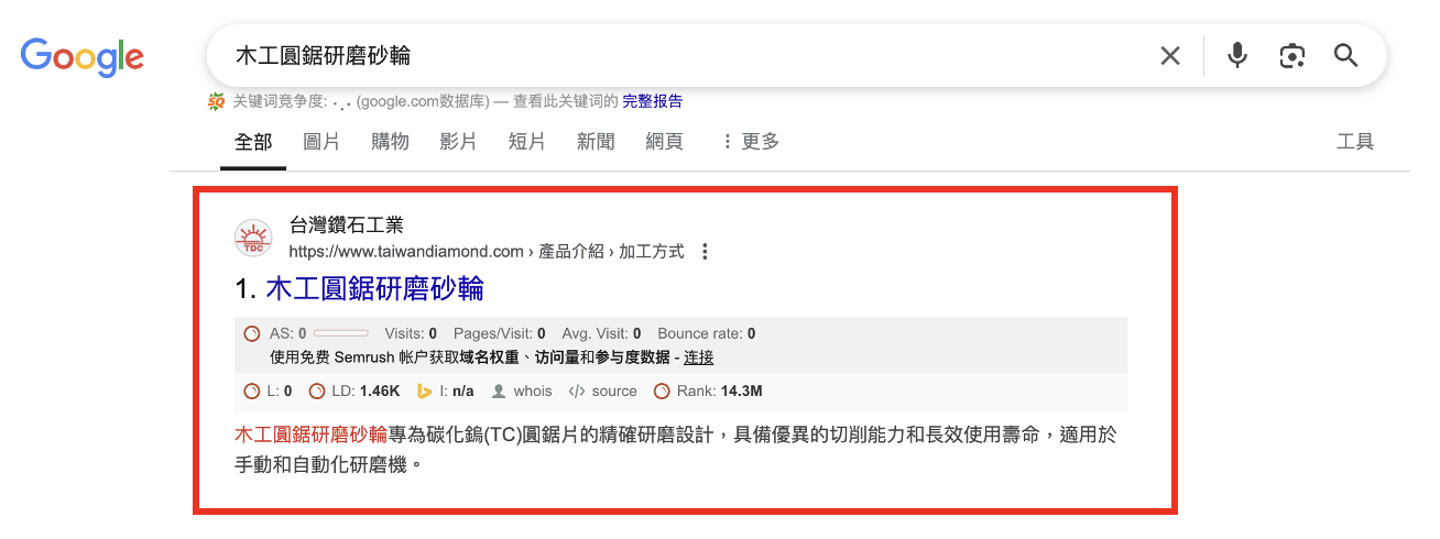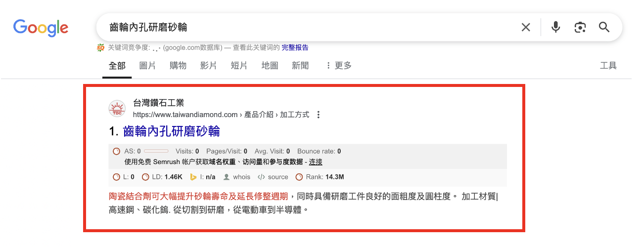 言青團隊協助優化網站內容結構,並針對產品應用、產業關鍵字進行技術型 SEO 佈局,提升搜尋結果中的專業可信度與點擊率。上線後自然流量成長 51.6%、活躍使用者提升 30.6%。多組關鍵字如「滾齒刀-齒形研磨砂輪」與「減薄用金屬砂輪」排名第一,同時被 Google 收錄為精選摘要,強化台灣鑽石在高階製造領域的網路能見度。