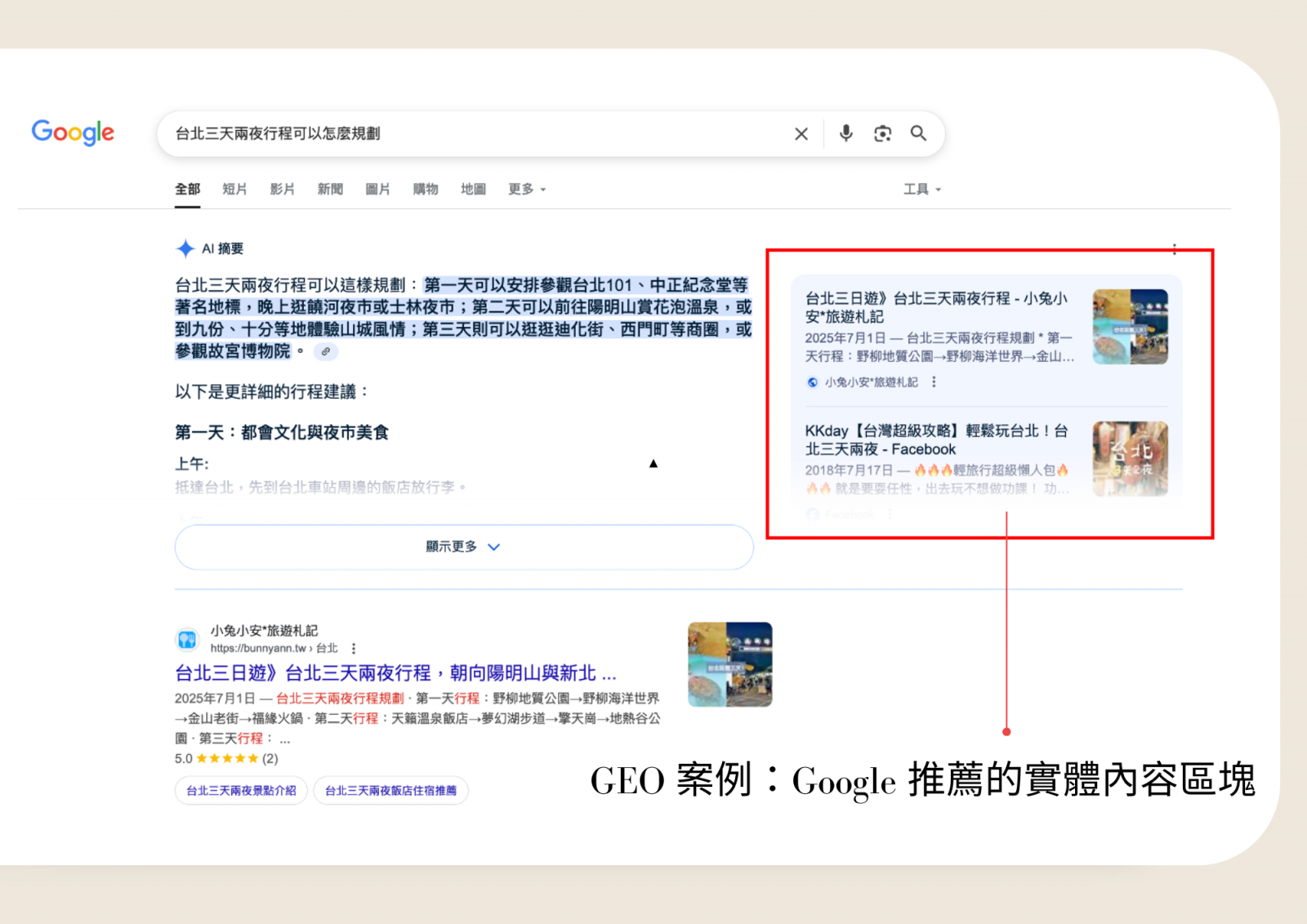 Google 搜尋「台北三天兩夜行程規劃」,左上是 SEO 排名內容,下面與右側則是 AI 摘要(SGE)自動整合的回答,兩者資訊來源可能不同.png)