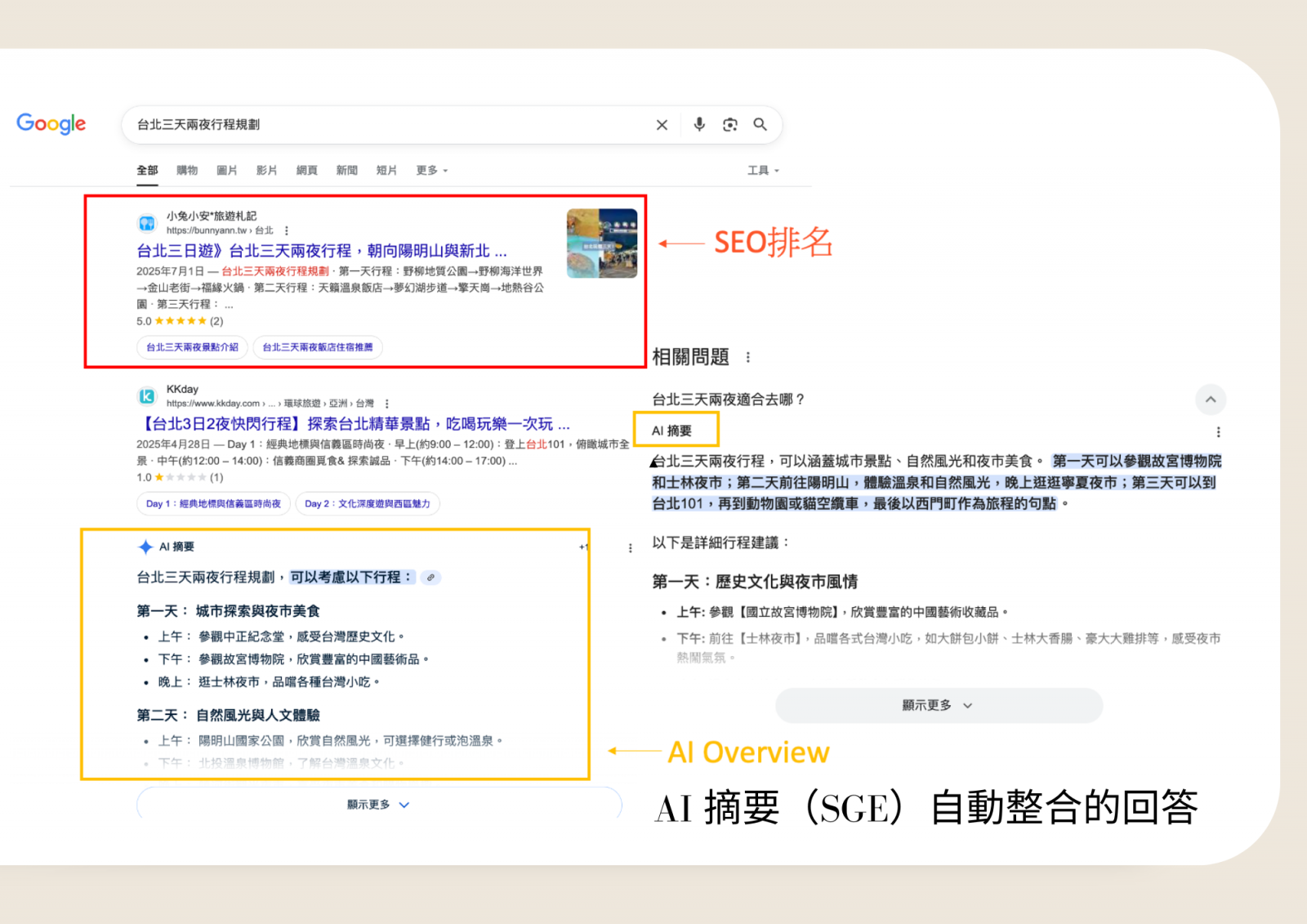 Google 搜尋「台北三天兩夜行程規劃」,左上是 SEO 排名內容,下面與右側則是 AI 摘要(SGE)自動整合的回答,兩者資訊來源可能不同.png)