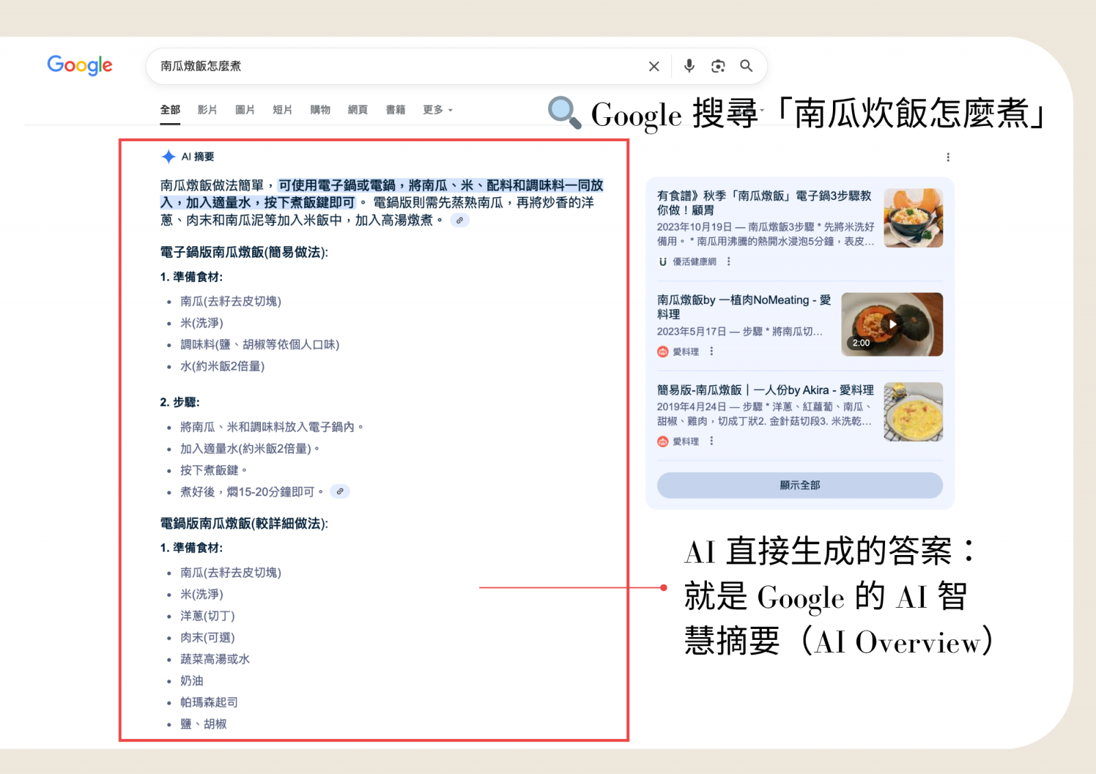 ▲ 以「南瓜炊飯怎麼煮」為例,Google 優先顯示 AI 整理的做法與材料步驟,使用者不需點進網站就能得到解答
