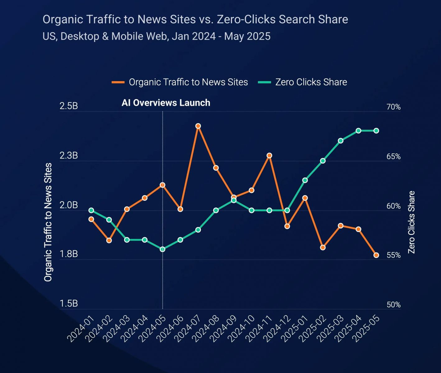 ・根據 Search Engine Roundtable 引用 Similarweb 報告,自 Google 在 2024 年 5 月推出 AI Overviews 功能以來,美國的「零點擊搜尋」比例已從 56% 上升至 69%